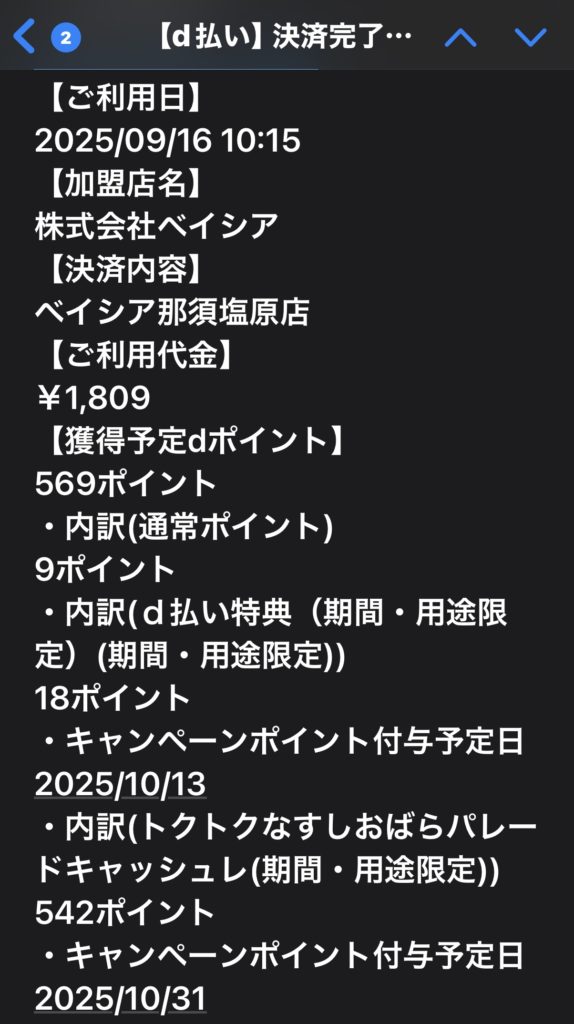上がスマホに届いた情報です。「トクトクなすしおばらパレードキャッシュレ」がキャンペーンの名前です。確かに、1,809円の買い物をしたら30%に相当する542ポイント付いています。このような方法は、なかなか画期的だと思います。
