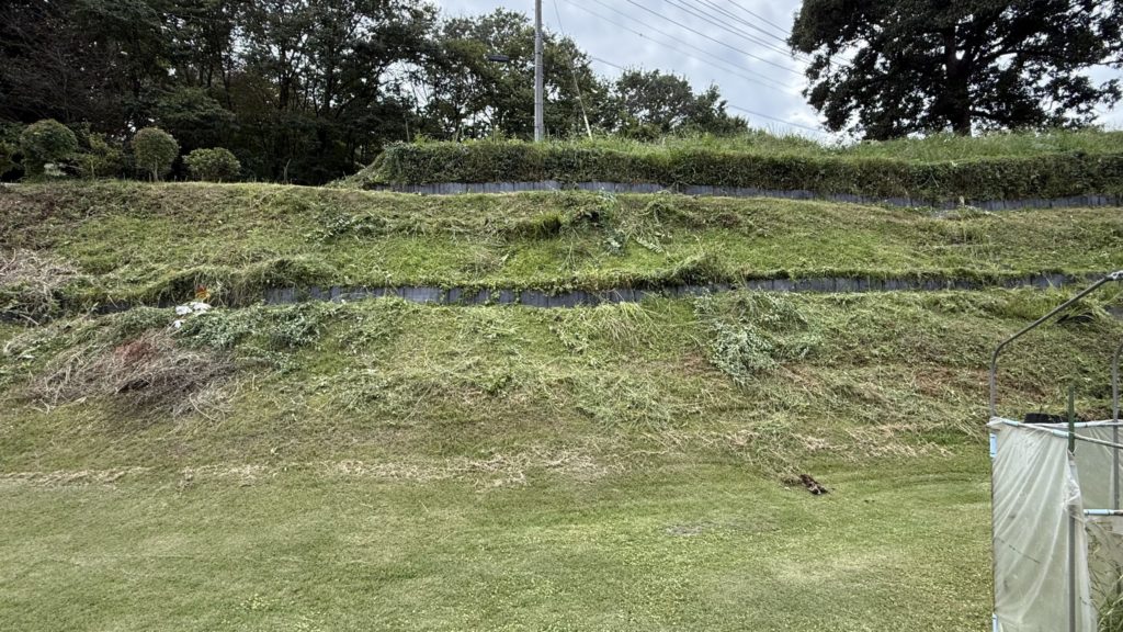 ①門から北側の芝刈り②ヘッジトリマーを使った西斜面と北斜面の部分的な草刈り③東側擁壁面へデラの剪定(写真なし)④北側の樹木の枝払い