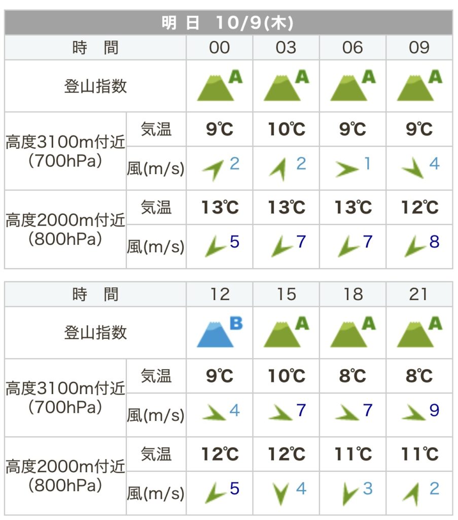 10/9の天気(気温・風速を含む)は、いい感じです。12時にBがついているのが謎ですが、12時には下山しているので、問題はないないでしょう。