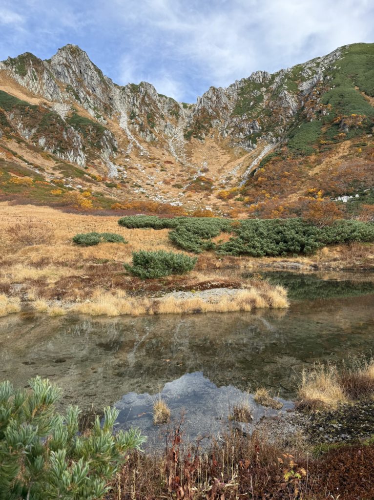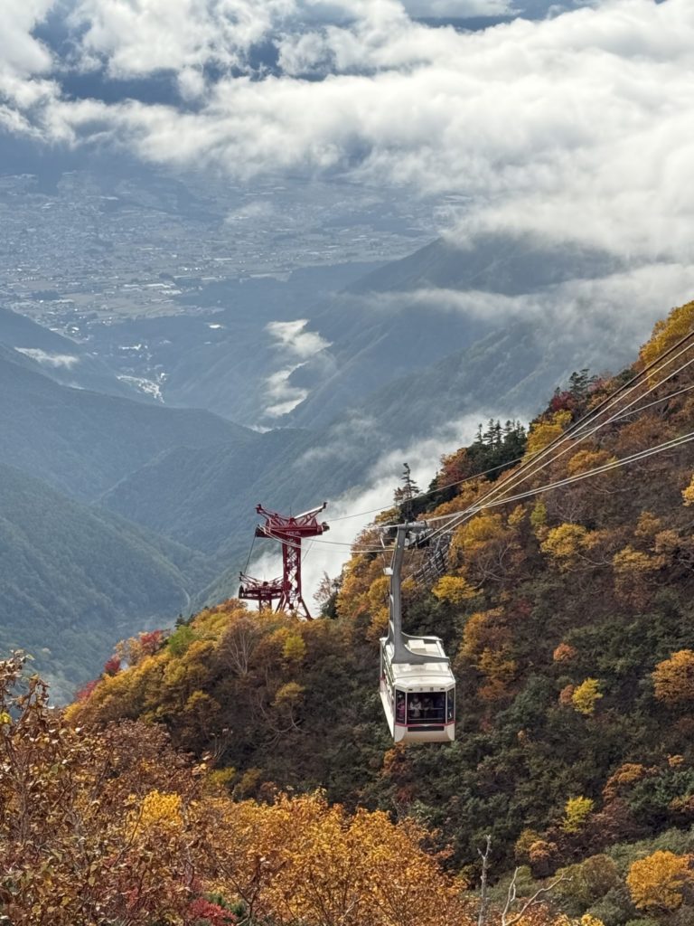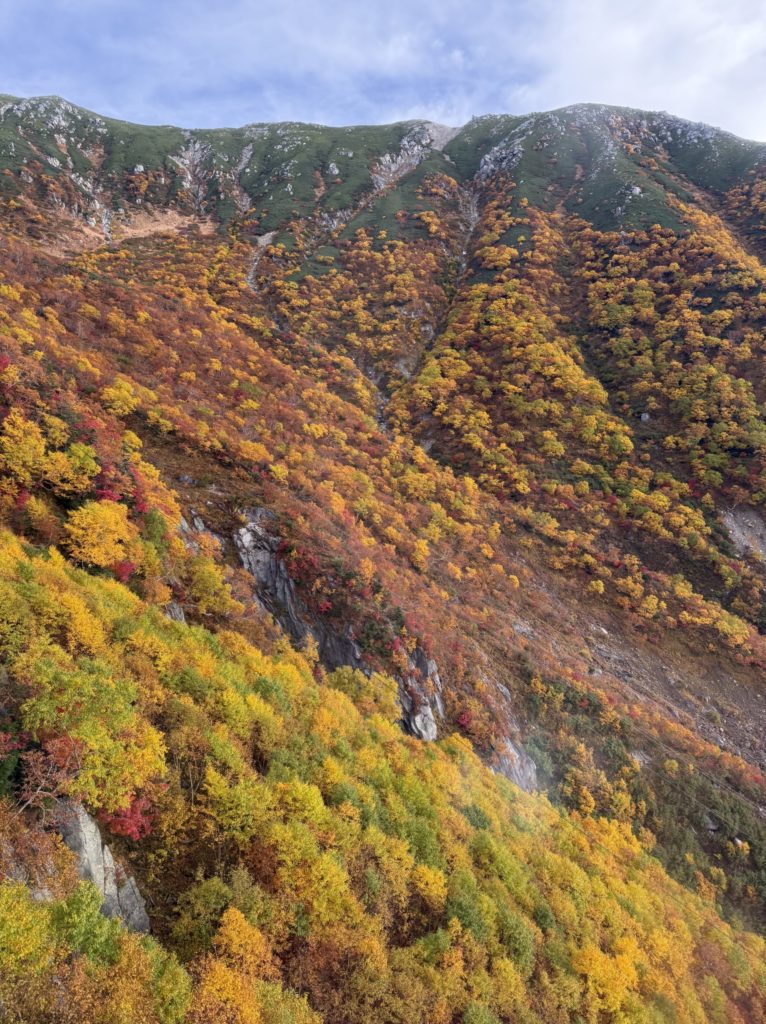 ロープウェイが千畳敷駅に近づくと、右側の斜面の絶景に感動しました。乗客たちの感動の声が上がりました。おそらく、今年一番の色づきと天気なのだと思いました。