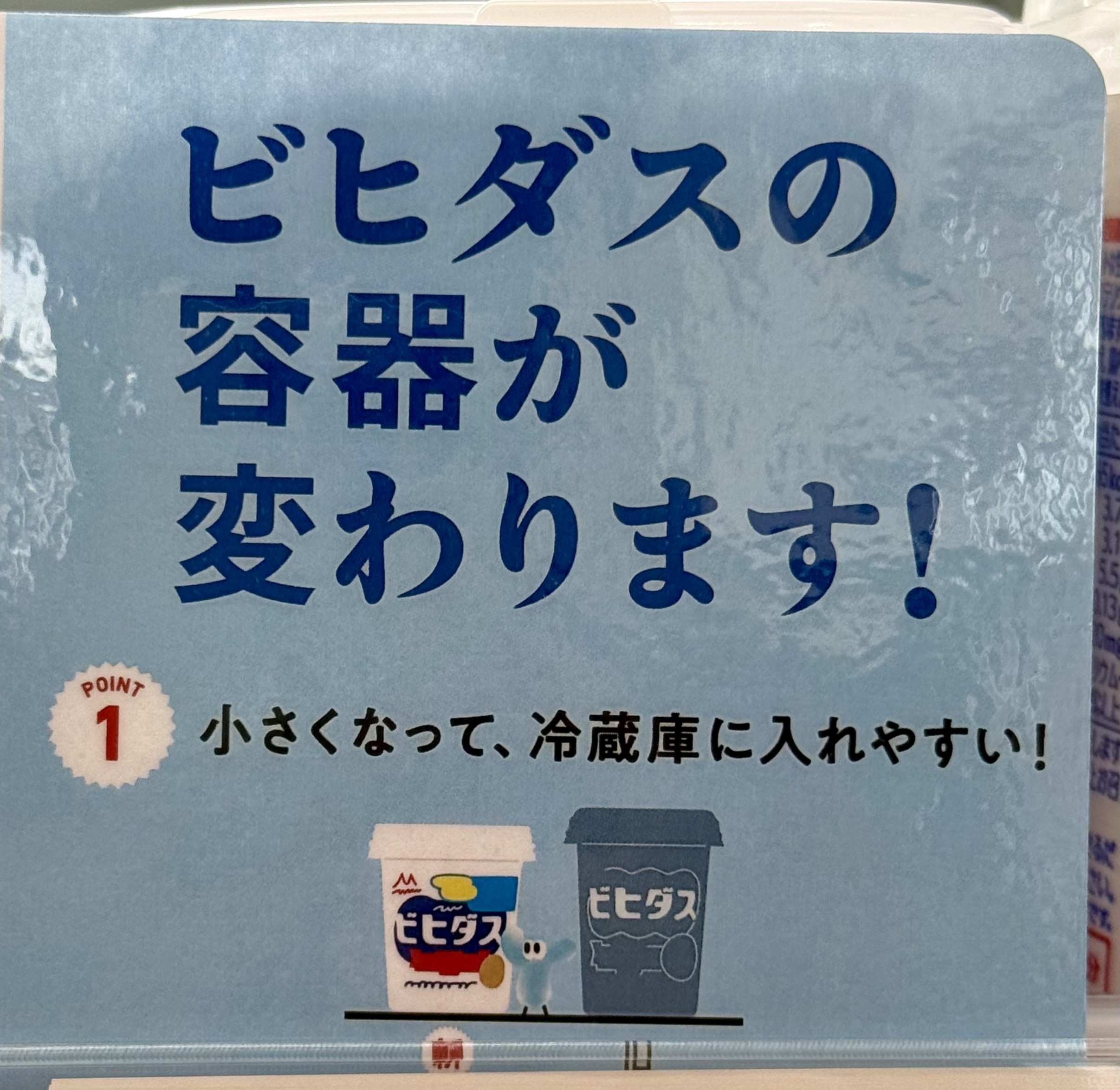 先日、スーパーでこんな表示を発見しました。「ビヒダスの容器が変わります。」小さくなって、冷蔵庫に入れやすい!