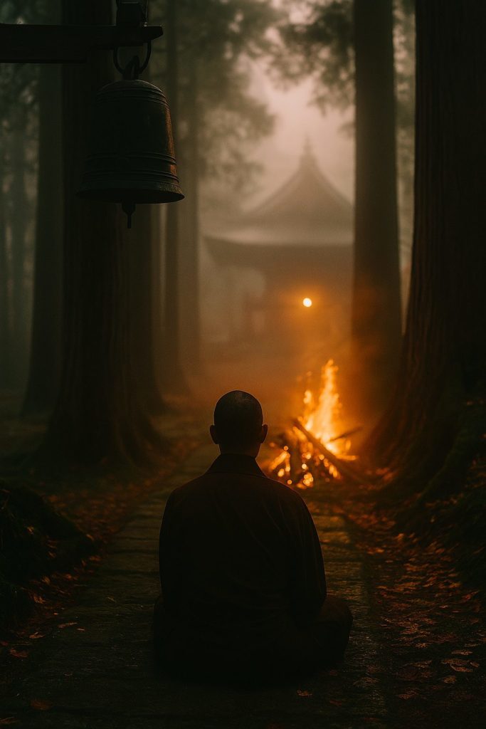 杉の影に包まれ、鐘の音が旅の始まりを告げる。
