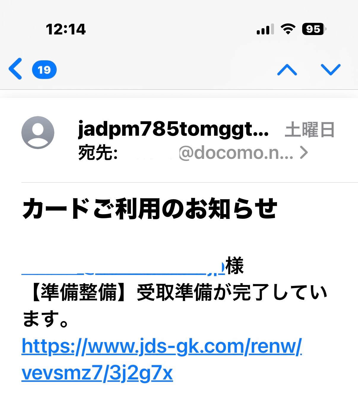- 送信元アドレスが不審:「jadpm785tomggt…」という不明な文字列のメールアドレスは、正規のカード会社とは無関係です。