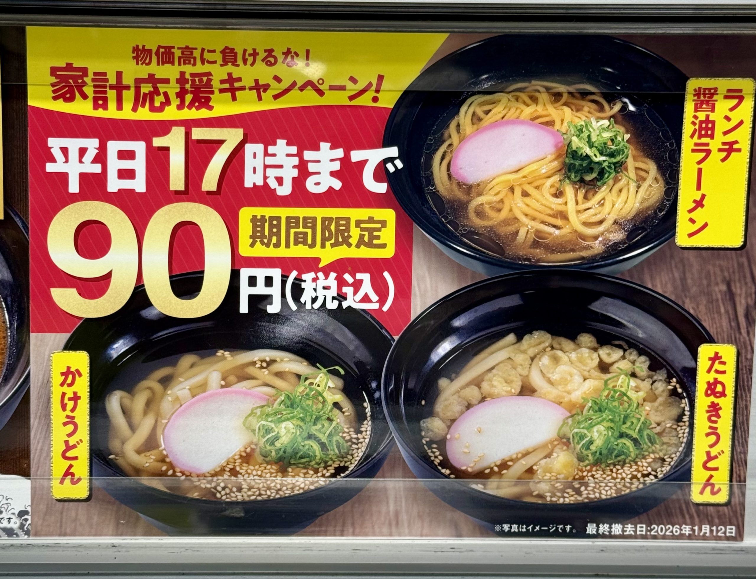 家計応援キャンペーン 今日のできごと 2025.11.22 昨日、魚べいに行ったら、90円のうどんを発見しました。どこかで見た記憶があります。 ここにあったんですね。 1/12までやっているようなので、またキャンペーンに参加したいと思います。