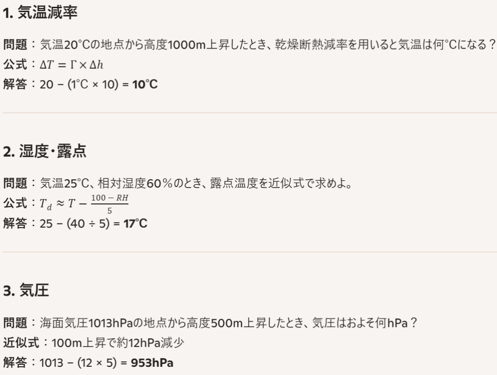 - 出題頻度が高いのは 気温減率・湿度・気圧補正。