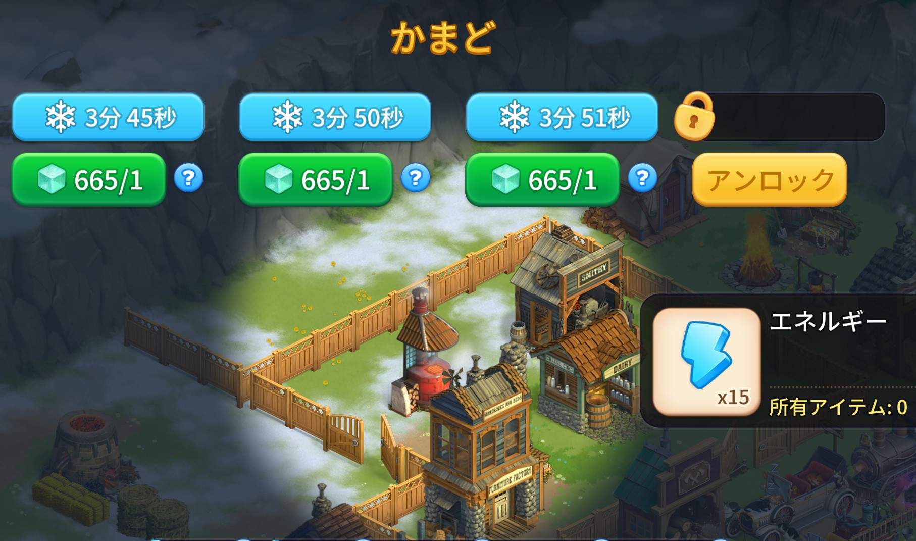 この中に、かまどというアイテムがあって、そこはエネルギーを生産するための施設です。ここで、エネルギーを生産するためには、5分の待ち時間が必要です。