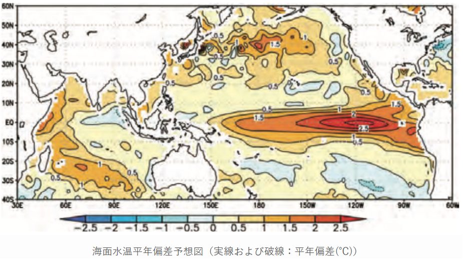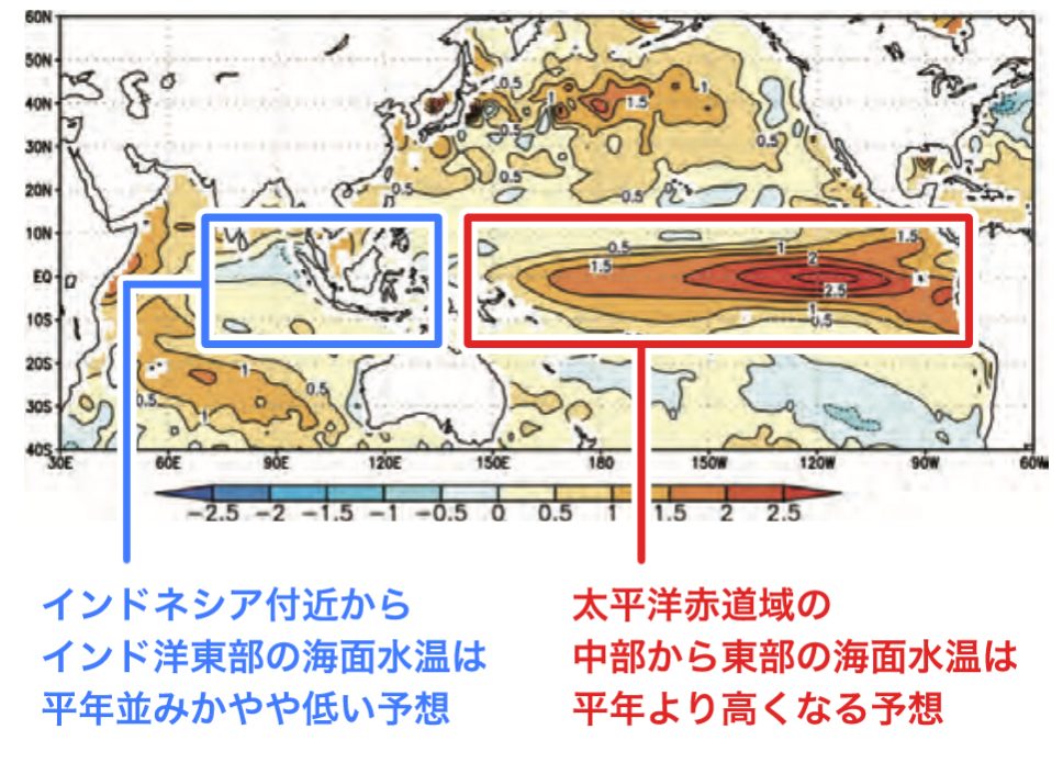 上図を見ると、太平洋赤道域の中部から東部 の海面水温は平年より 高く なる予想であり、インドネシア付近からインド洋東部 にかけては 平年並みかやや低い 予想になっていることが分かります。