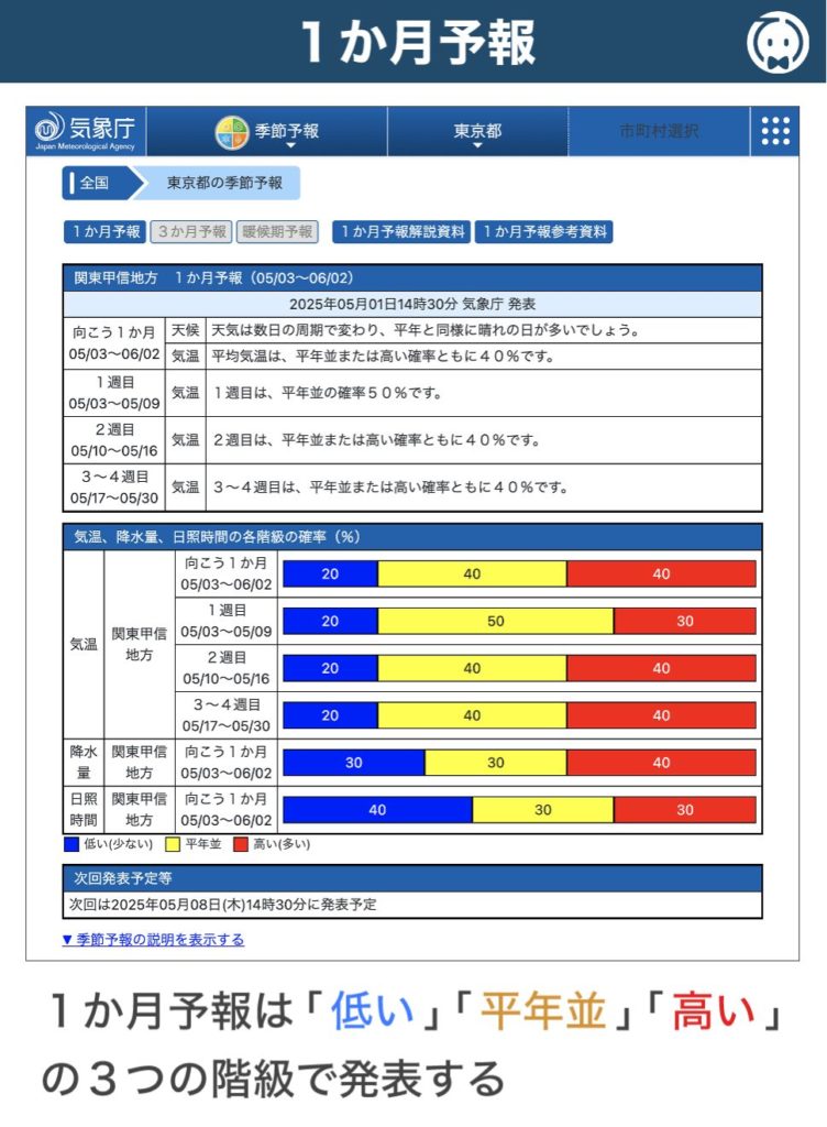 1か月予報 では、向こう1か月の平均気温や合計降水量、合計日照時間を 具体的な数値 で示すのではなく、平年値と比べて「 低い(少ない)」「 平年並 」「 高い(多い)」の3つの階級 に分けて発表します。