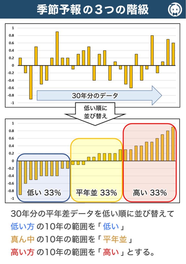 過去30年間の気象データを使って「 低い(少ない)」「 平年並 」「 高い(多い)」の3つの階級を決める際は、データを低い順に並べ、下から10年分 を「 低い 」、真ん中の10年分 を「 平年並 」、上から10年分 を「 高い 」と分類します。