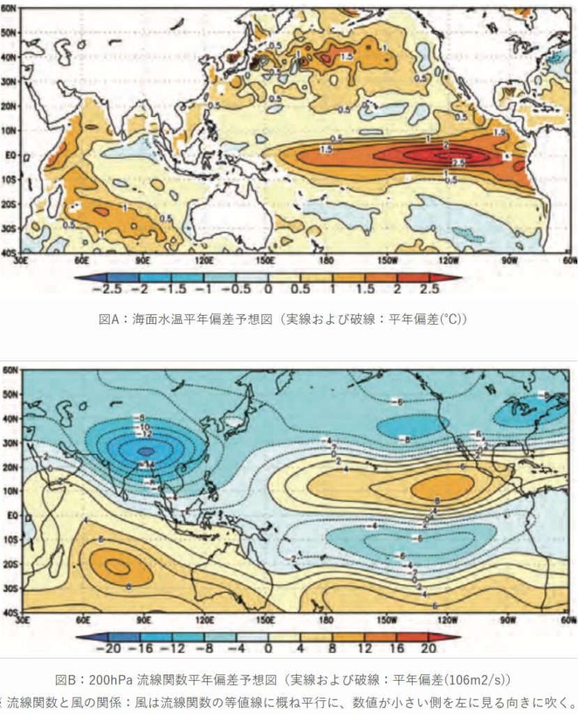 ⑧下図は、3か月予報の基礎資料となる、ある冬 (12月~2月) の数値予報による予想図であり、図Aは海面水温の平年偏差、図Bは200hPa流線関数の平年偏差の予想図である。図Aの海面水温分布に対応して、インドネシア付近からインド洋東部にかけては降水量が平年より少ない予想 (図略) であり、このことが影響して、図Bでは、中国大陸から日本付近にかけての流れは、平年に比べて中国大陸では北に、その東側では南に蛇行する予想となっている。