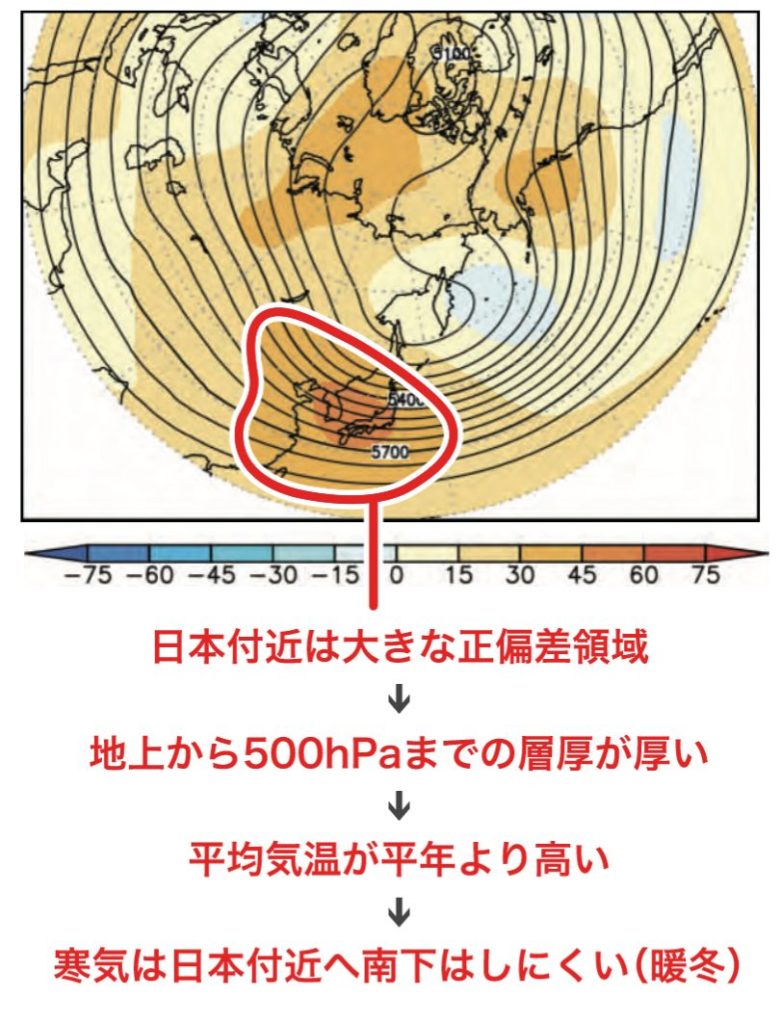 これは、地上から500hPaまでの層厚が 厚く 、この間の平均気温が平年より 高い ことを意味しています。このことから、寒気は日本付近へ南下しにくく、暖冬 を予想していることが分かります。