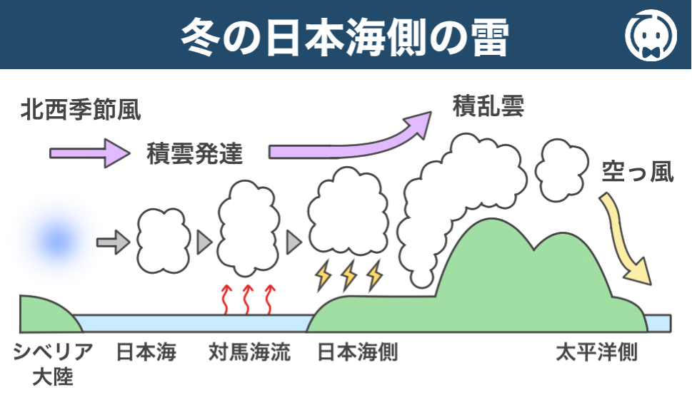これらの要因が組み合わさることで、冬の日本海側では雷が頻繁に発生します。
