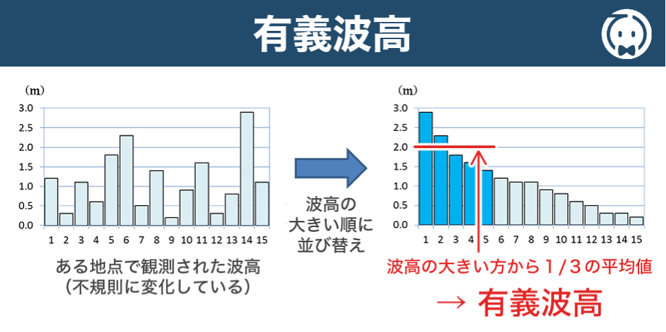 ある地点で連続する波を1つずつ観測したとき、波高の 高い 方から順に全体の1/3の個数の波(例えば100個の波が観測された場合、高い方から33個の波)を選び、これらの波高および周期を平均したものをそれぞれ 有義波高、有義波周期 と呼び、その波高と周期を持つ仮想的な波を 有義波 と呼びます。