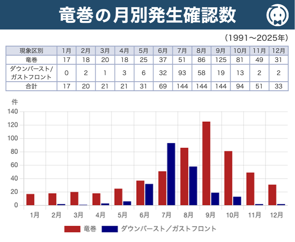 冬季の日本海側で発生する積乱雲は、夏季に比べて雲頂高度が 低い 傾向がありますが、これは竜巻が 発生しない理由にはなりません。実際には、冬季の積乱雲でも雷の強さは夏季と ほぼ同じ であり、強い鉛直シアーや寒気の流入などの条件が揃うと、竜巻が起こる ことが確認されています。