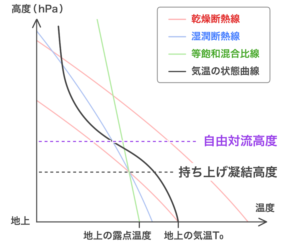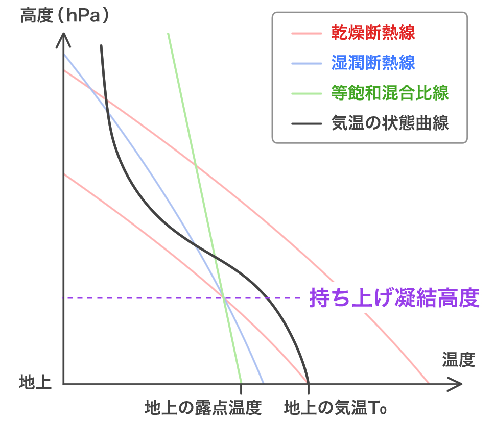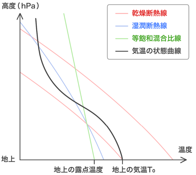 ③地上では飽和していないが上空に条件付不安定な気層を持つ大気の状態曲線がエマグラムに記入されており、地上の気温が点T0として示されている。この点T0を通る乾燥断熱線と、地上の露点温度の点を通る等飽和混合比線との交点が持ち上げ凝結高度となる。