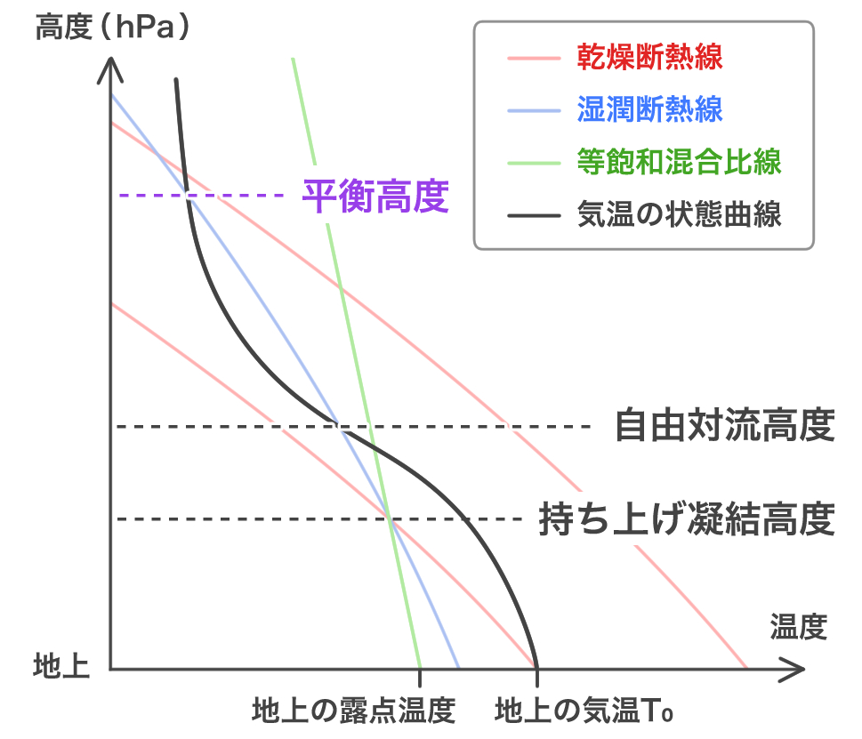④自由対流高度より上で、気温の状態曲線が湿潤断熱線と再び交わる高度を平衡高度といい、平衡高度は雲頂に対応している。