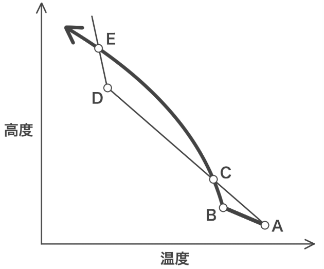 C点より上は自らの浮力で上昇し、E点の 平衡高度 で再び周囲の空気の温度と同じになり、空気塊は浮力を失います。