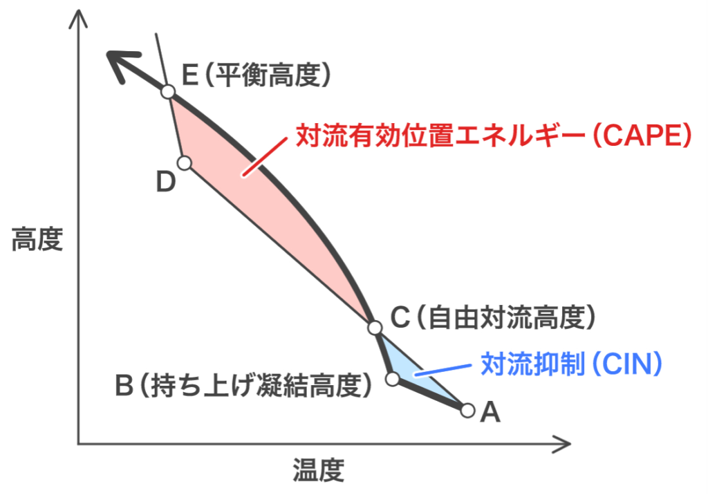 一方、CDEで囲まれた領域の面積を 対流有効位置エネルギー(CAPE)といい、この面積が大きいほど空気塊の温度が周囲の大気の温度より大きいため、対流が発達しやすい ことを意味します。