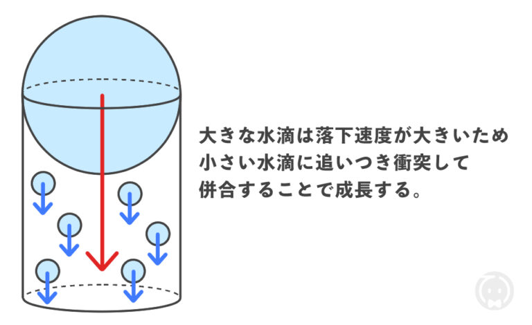 さらに、大きい雲粒ほど落下速度が大きいので、雲粒が落下する過程で大きい雲粒が小さい雲粒にぶつかってくっつくことでより大きく成長します。