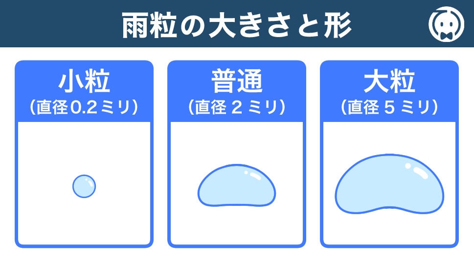 雨粒の大きさは 直径約1~2mm のものが多く、直径約0.5mm以下になると霧雨、雷雨の時は直径約3~5mmになることもあります。