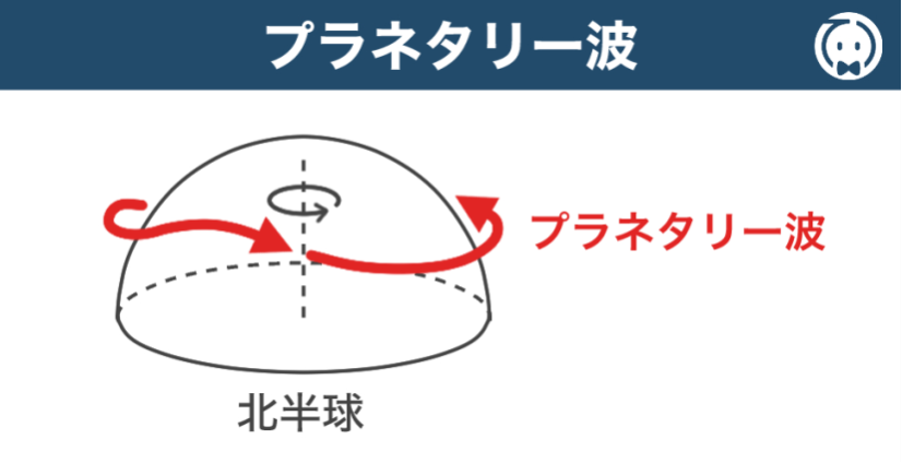 プラネタリー波 とは、波数が1~3の超長波の波動のことです。停滞性のプラネタリー波の振幅は、大規模な山岳に偏西風が衝突することによる 力学的効果 や、大陸上の大気と海洋上の大気の加熱の違いによる 熱的効果 が大きいほど、大きく なります。