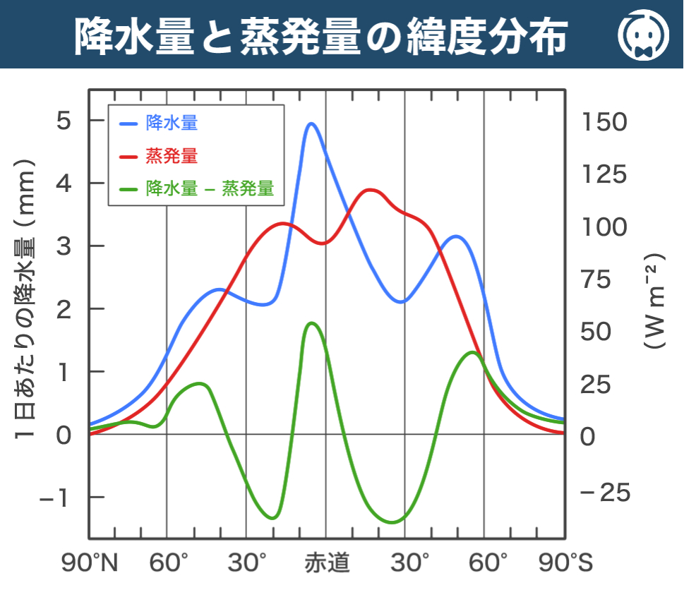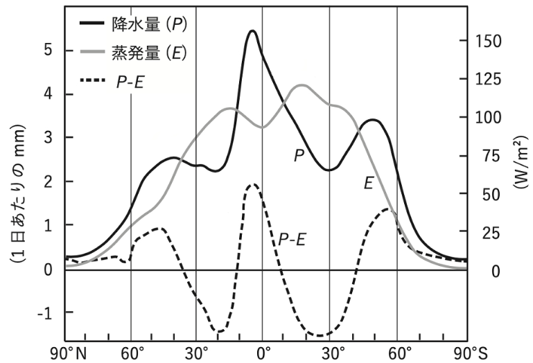 赤道付近にある 熱帯収束帯 では、蒸発量が降水量よりも 少ない ことが分かります。これは、亜熱帯高圧帯で蒸発した水蒸気が熱帯に運ばれることで、積乱雲 などによる雨に変わるためです。