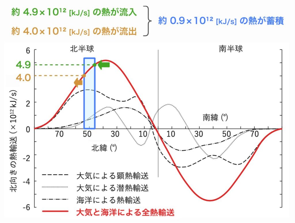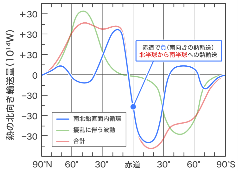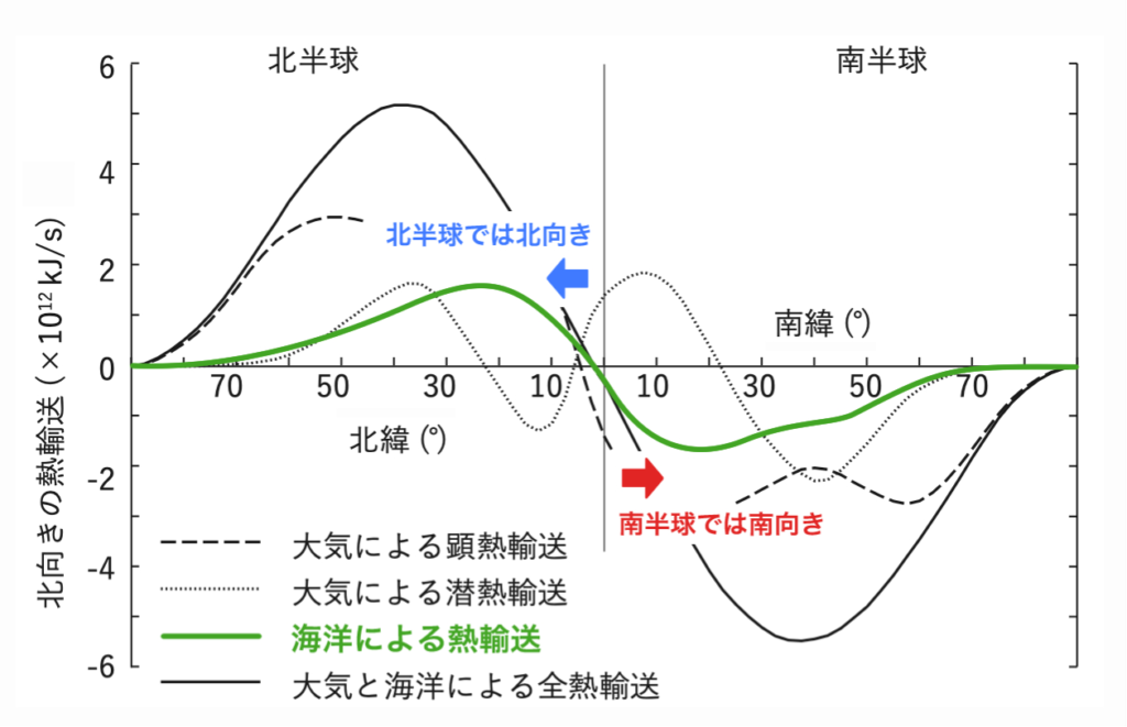 下図の「 海洋による潜熱輸送 」を見ると、北半球では 北向きの熱輸送、南半球では 南向きの熱輸送 となっていることが分かります。