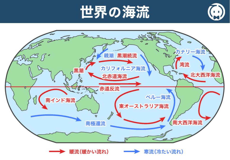 これは、下図のように、海洋では、黒潮 などの極向きの海流によって 高温 の海水が低緯度から高緯度に、カリフォルニア海流 などの赤道向きの海流によって 低温 の海水が高緯度から低緯度に輸送されているためです。熱エネルギーは、暖かい方から冷たい方へ移動しますので、結果として海洋では、熱エネルギーが、低緯度から高緯度に輸送されていることになります。したがって、海洋では、海流により高温の海水が低緯度から高緯度に、低温の海水が高緯度から低緯度に運ばれることにより、低緯度から高緯度に熱が輸送 されていますので、答えは 正 です。