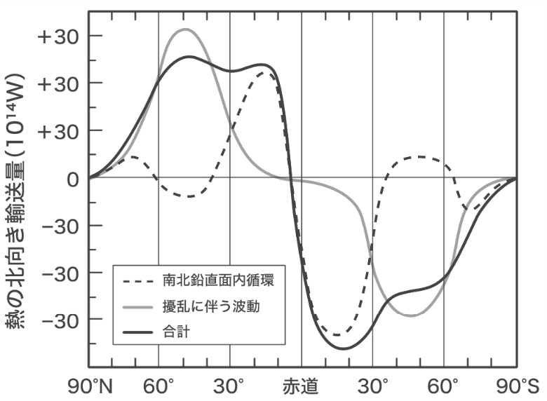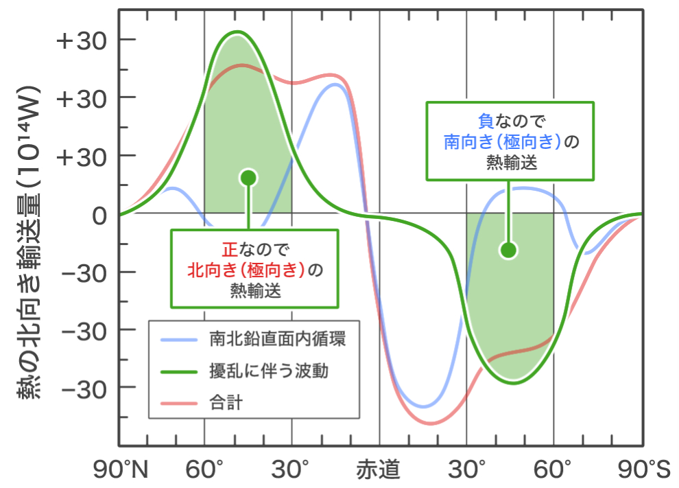 両半球の緯度30°~60°で、低気圧・高気圧などの 擾乱に伴う波動による熱輸送量(緑線) が、北半球では 正 で北向き(=極側)に、南半球では 負 で南向き(=極側)に、それぞれ熱を輸送しているのが読み取れます。したがって、答えは 正 です。