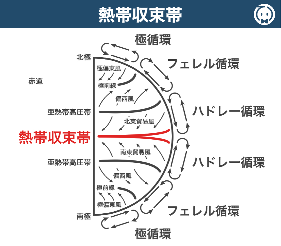 赤道付近にある貿易風(北東偏東風と南東偏東風)が吹き込んで気流が収束する領域を、熱帯収束帯 といいます。ここは、収束による上昇気流によって 積乱雲 が発生しやすく、台風 の発生地帯でもあります。したがって、答えは 正 です。