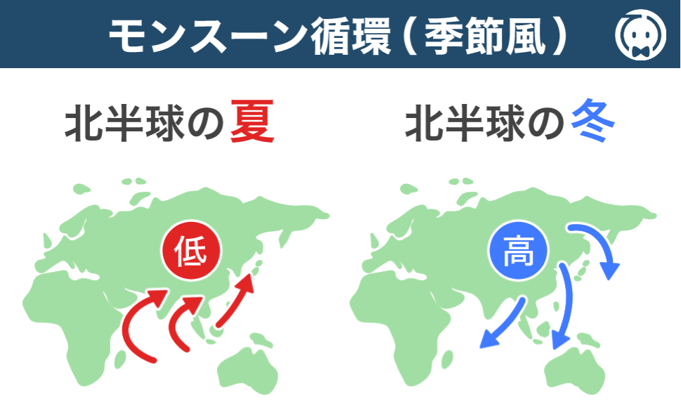 モンスーン循環(季節風) とは、主に大陸と海洋の温度差(熱的コントラスト)によって生じる大規模な大気の循環のことです。