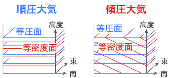 等圧面と等密度面(等温面)が平行で交わらない大気を 順圧大気 といいます。