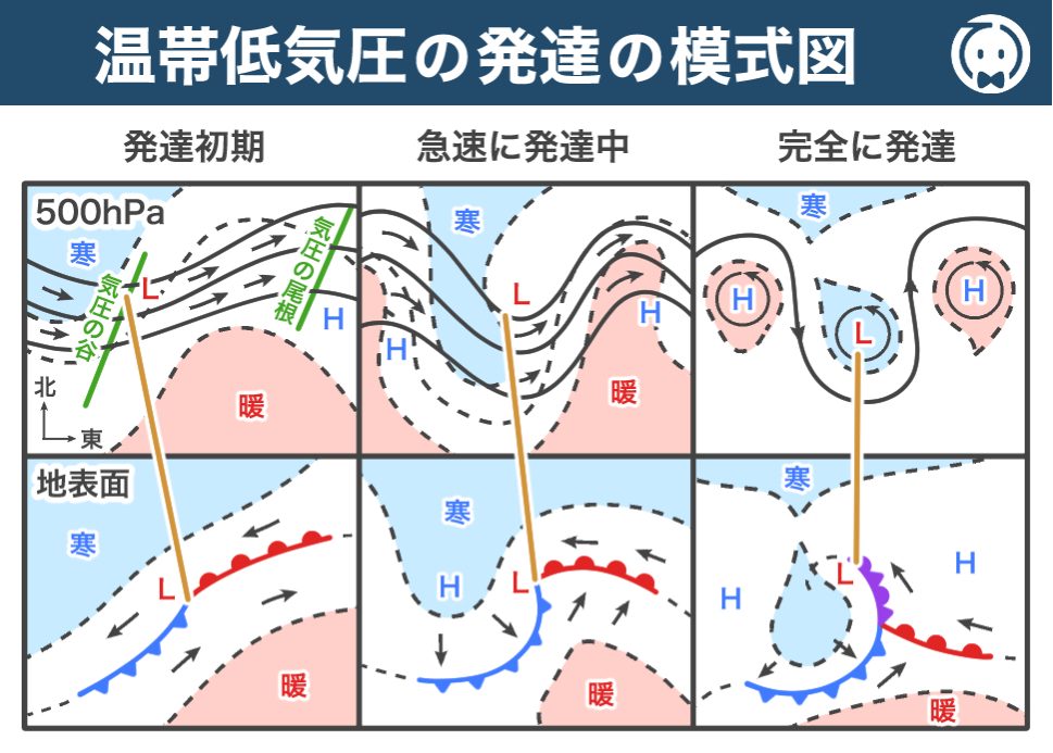 このケースでは、日本海中部に発達中の地上低気圧があり、その西側には500hPaの気圧の谷が位置しています。