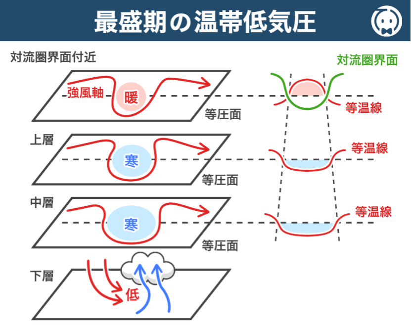 一方、下部成層圏 では、対流圏界面の高度が低くなるのに伴って、空気が下方に引きずり下ろされることで 断熱圧縮 し、周囲よりも気温が 高く なります。したがって、発達しきった最盛期の温帯低気圧の上空では、対流圏界面が周囲より「高く」ではなく「 低く 」なっていますので、答えは 誤 です。