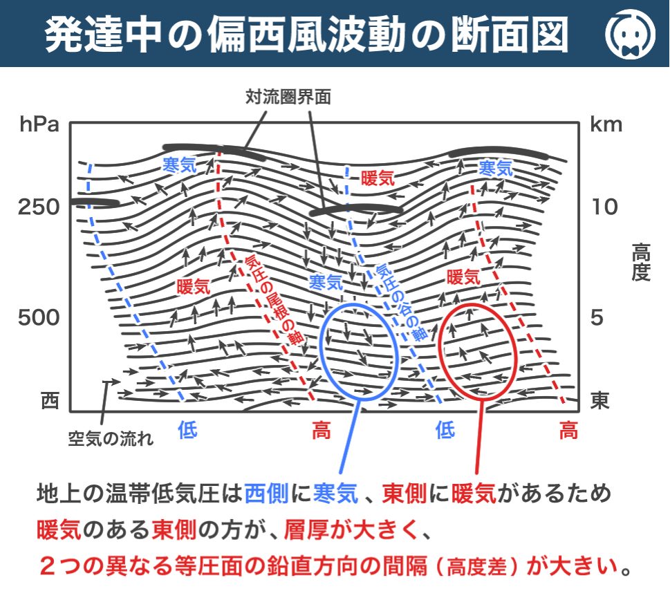 下図は、発達中の偏西風波動の東西鉛直断面図です。温帯低気圧の前面では 暖気移流 、後面では 寒気移流 になっているので、下図を見ると、暖気 のある低気圧前面の方が 層厚が大きく 、等圧面
