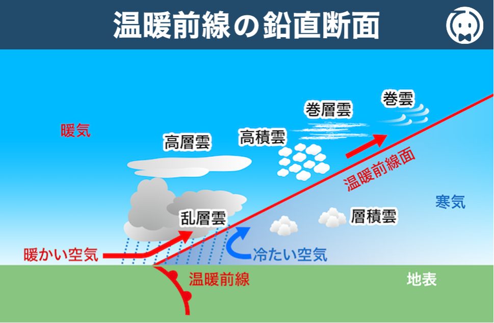 そして、地上の温暖前線の上を越えて、温暖前線面の上を上昇し、対流圏の上層 に達することで 上層雲域 を形成します。