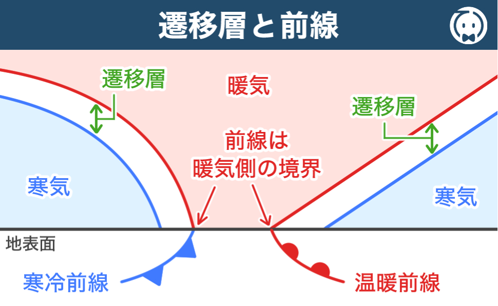 遷移層(転移層)とは、密度の異なる気団が接している気層のことです。地上天気図では、遷移層が地表面と交わる 暖気側 の境界を前線としています。したがって、地上天気図の寒冷前線は、温度の異なる気団の間の遷移層の「寒気側」ではなく「暖気側」の境界が地表面と交わるところに描かれていますので、答えは 誤 です。