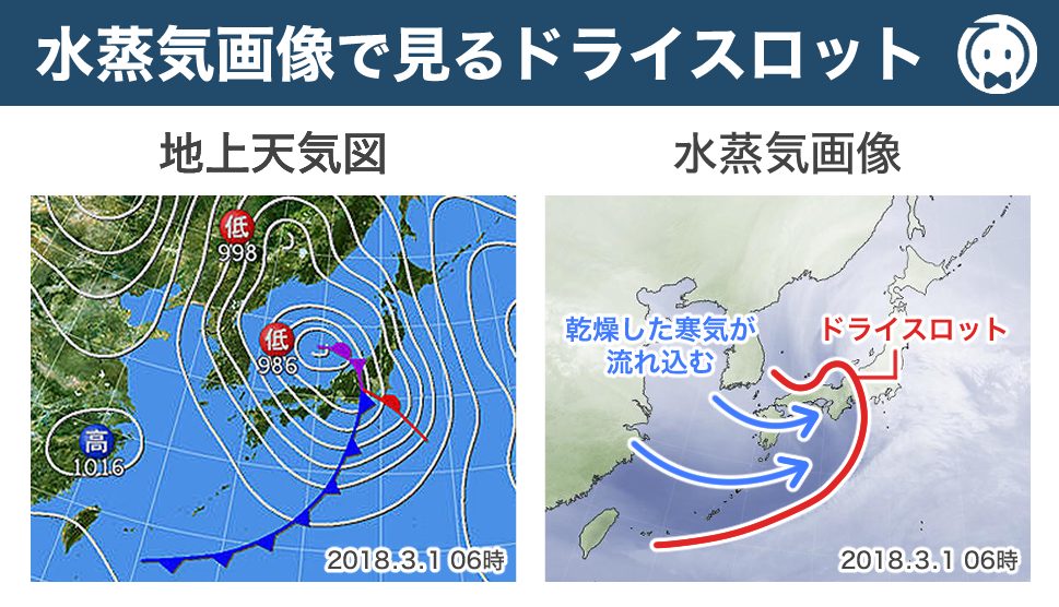 具体的には、低気圧の後方(西側)から 乾燥した寒気 が流れ込み、これが上空の強い風とともに低気圧中心へ向かうことでドライスロットが形成されます。