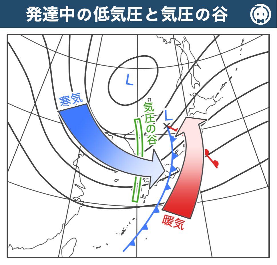 この気圧の谷は東へ進んでおり、その移動に対して相対的な空気の流れを太い矢印で示しています。