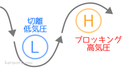 ブロッキング高気圧 とは、中高緯度偏西風帯のジェット気流が大きく南北に蛇行・分流し、その状態が概ね一週間以上の長い期間にわたって続くことで、局所的に発生する高気圧のことです。ジェット気流が大きく蛇行すると、高緯度側 では ブロッキング高気圧 が形成され、低緯度側 では 切離低気圧 が形成されることがあります。