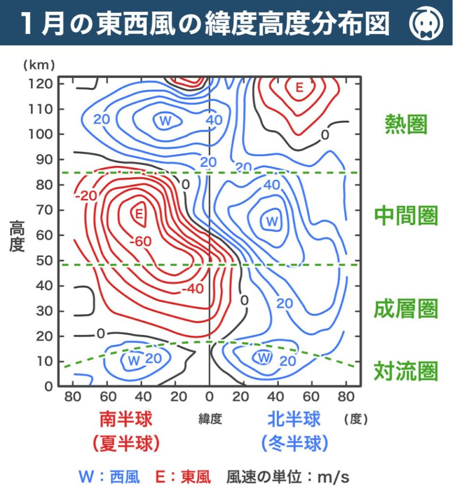 ②1月の北半球中高緯度における経度方向に帯状平均した東西風は、成層圏ではほぼ西風、中間圏ではほぼ東風となっている。🔴