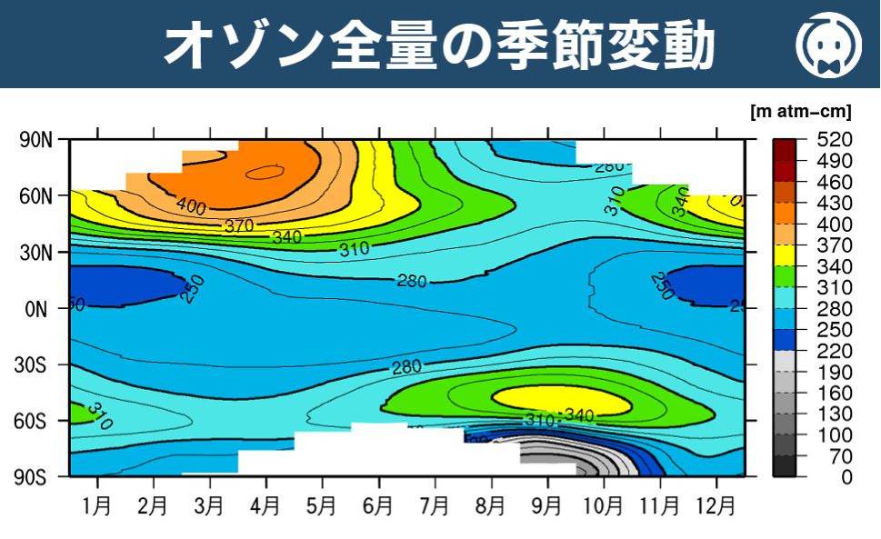 オゾンは、紫外線による光化学反応で主に 低緯度の成層圏 で生成されます。