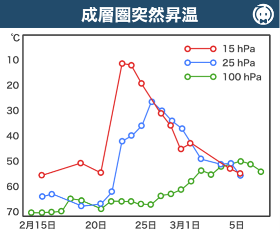 上図を見ると、15hPa(高度約30km)→ 25hPa(高度約24km)→ 100hPa(高度約16km)と、 上層から昇温が始まり 、気温が急激に上昇していることが分かります。したがって、成層圏突然昇温は対流圏からの プラネタリー波の伝播 により引き起こされ、「下層」ではなく「 上層 」から昇温が始まりますので、答えは 誤 です。