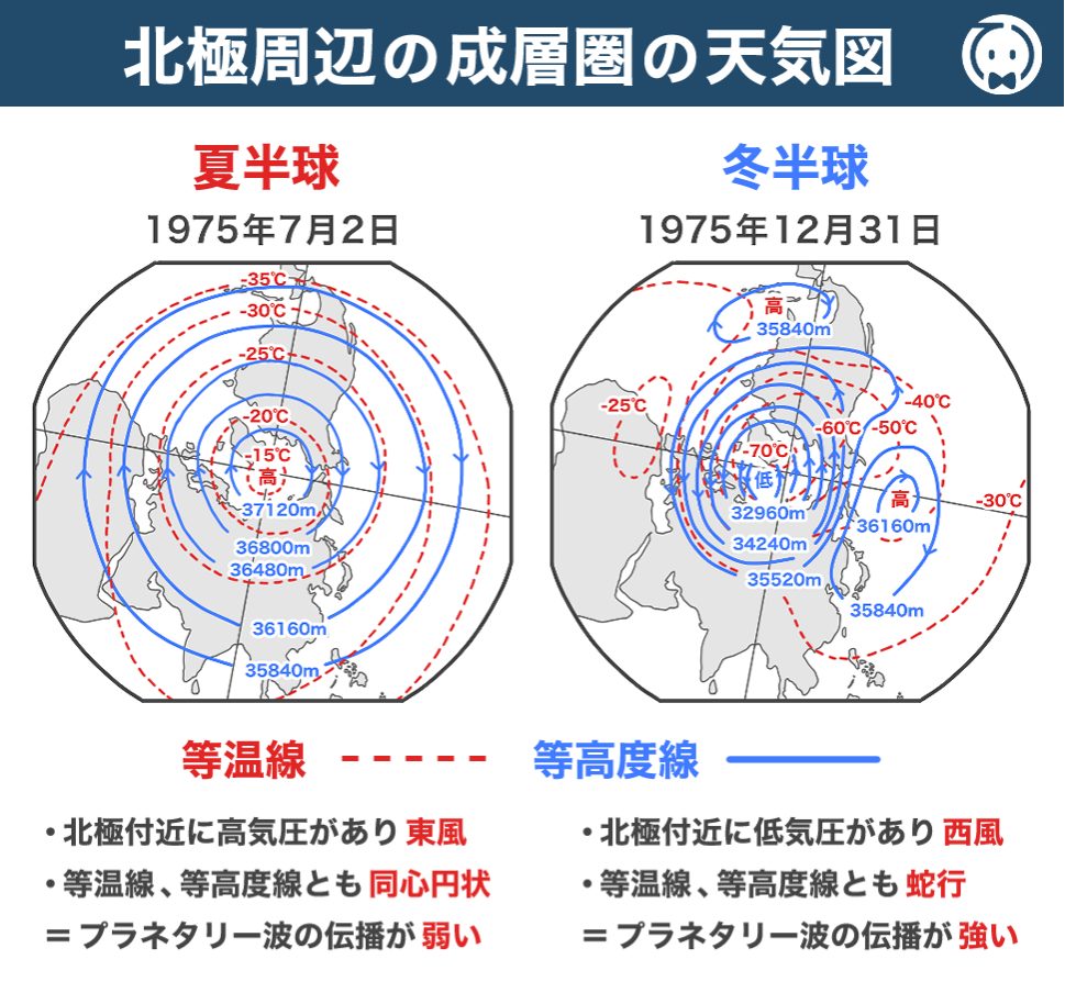 実際に、北半球の成層圏が 夏半球 の時と 冬半球 の時の天気図を比較すると、夏半球 の時は、北極付近に高気圧があり、中高緯度で東風、等温線および等高度線はともに 同心円状 になっていることが分かります。