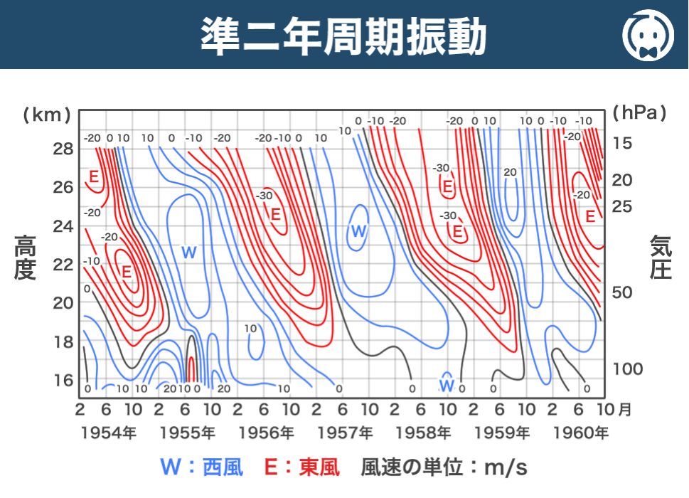 準二年周期振動(quasi-biennial oscillation:QBO)とは、赤道域の下部成層圏で、東風と西風が約26か月ごとに交代 する現象のことです。