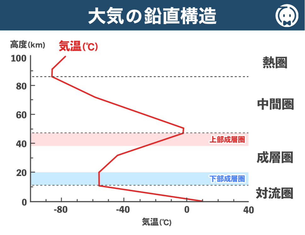 上部成層圏 は 下部成層圏 に比べて、上空に行くほど 気温が大きく変化 しています(= 気温の鉛直勾配が大きく なっています)。