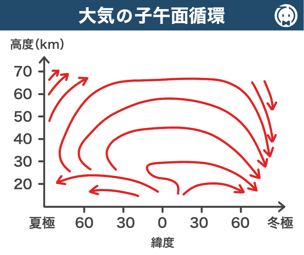 一方、中間圏では、大気の大規模循環による空気の断熱変化により、夏半球 では上昇気流による断熱膨張によって気温が 低く なるのに対し、冬半球 では下降気流による断熱圧縮によって気温が 高く なります。
