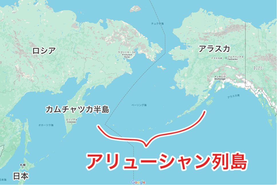 アリューシャン列島とは、アラスカからカムチャツカ半島へ連なる諸島群です。