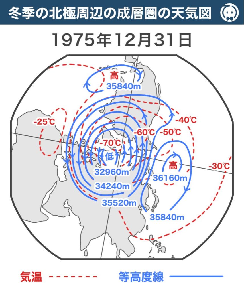 下図は、1975年12月31日の北極を中心とした成層圏(5hPa(=高度約35〜37km))の天気図です。