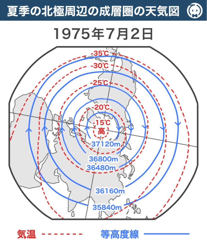 下図は、1975年7月2日の北極を中心とした成層圏(5hPa(=高度約35〜37km))の天気図です。